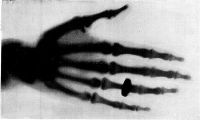 Figure 1.3.21.3.2: Röentgen is the father of the X-ray. while working with experiments and procedures of previous scientists, Röentgen noticed that even through secured chambers for light, an unknown energy was emitted that reacted with phosphorescent materials he was using in his experiments. his discovery and subsequent papers earned him the Nobel Prize in Physics in 1901. He used his wife’s hand to determine if the new rays could pass through the body.