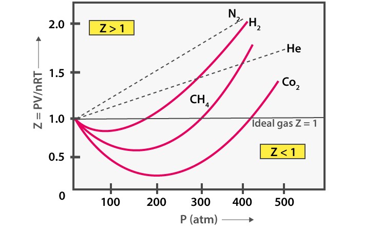 ii) Z > 1. PVm > RT. The gases having compressibility greater than 1 have a positive deviation from the ideal gases at all temperatures and pressures. Hydrogen and noble gases, except krypton, are examples.