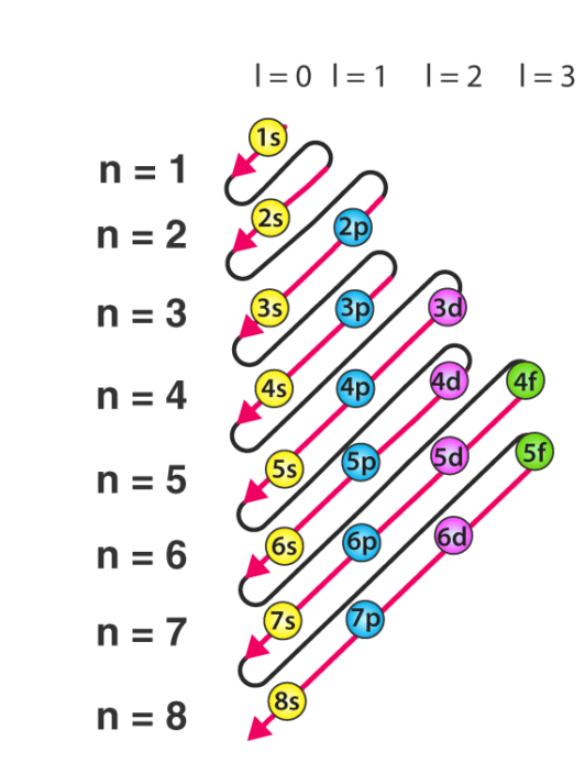 The word ‘Aufbau’ has German roots and can be roughly translated as ‘construct’ or ‘build up’. A diagram illustrating the order in which atomic orbitals are filled is provided below. Here, ‘n’ refers to the principal quantum number and ‘l’ is the azimuthal quantum number.