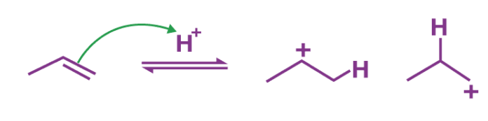 From the illustration shown above, we can see that there are two types of carbocations that can be formed from the protonation of the alkene, one is a primary carbocation and the other is a secondary carbocation. However, the secondary carbocation is far more stable and therefore, its formation is preferred over the formation of a primary carbocation.