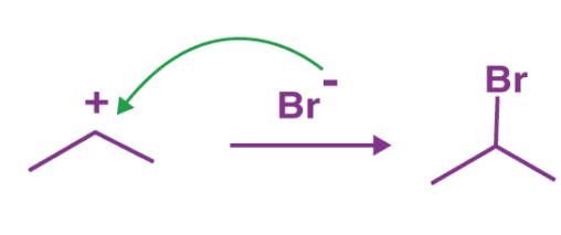 The halide ion nucleophile now attacks the carbocation. This reaction yields the alkyl halide. Since the formation of the secondary carbocation is preferred, the major product of this reaction would be 2-bromopropane as illustrated below.