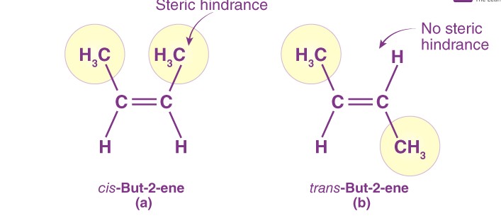 The structure and reactivity of many compounds in organic chemistry are greatly dictated by the presence of bulky groups or constituents in the molecule. This is called steric hindrance. It arises because of inter-electronic repulsions due to spatial crowding amongst bulky groups. Using steric factors, we can conclude that trans-2-butene is more stable than cis-2-butene.