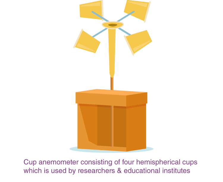- Cup anemometer: This consists of four hemispherical cups that are mounted on one end of the horizontal arms at equal angles on a vertical shaft. The positioning of the cups is such that the air passes through them in the horizontal direction making the cups rotate such that it is proportional to the speed of the wind. By calculating the turns of the cups over a period of time, the average speed of the wind is found. These are used by researchers, meteorologists, and educational institutions for research and commercial activities.