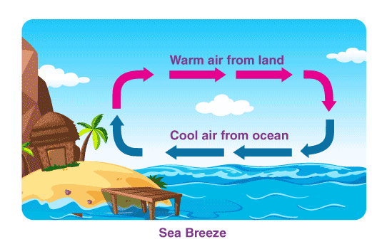 Seawater gets heated more slowly as compared to land. As the temperature of the land rises, the air above it gets heated by conduction. The density of warm air is less than the surrounding environment, because of which it rises, creating a vacuum in its place. The cooler air from the sea rushes to fill the vacuum which creates a cool coastal breeze. At night, the land cools off more quickly, which creates a temperature difference between the temperature onshore and that offshore. Because of this temperature difference, again, a pressure drop is created, establishing a land breeze.
