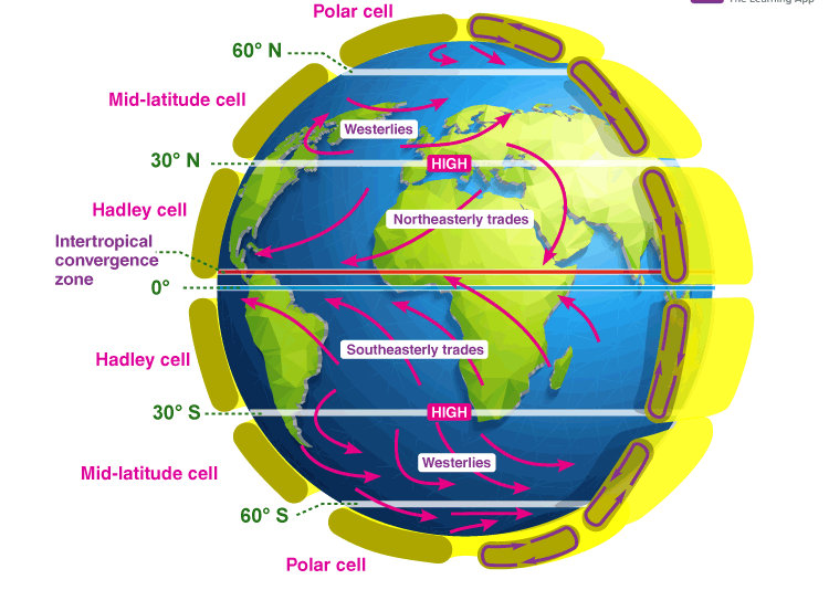 The equatorial and tropical regions (close to the equator) get the maximum heat from the sun; hence they get hotter than the polar regions. The air surrounding this region gets heated up and rises to create a vacuum. Cooler air from the poles rushes to fill the vacuum. The wind does not flow in the north-south direction because a change in direction is caused by the rotation of the Earth.