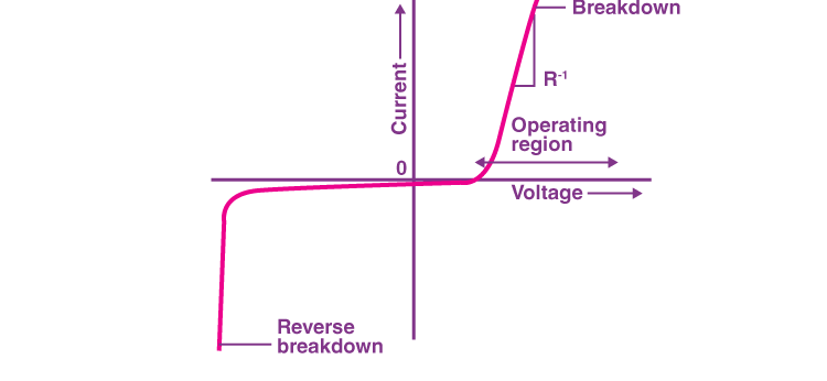 A circuit component has a non-linear characteristic if the resistance is not constant throughout and is some function of voltage or current. The diode, for example, has varying resistance for different voltage values. However, it has a linear characteristic for a narrow operating region. In the graph below, we can also see the maximum forward and reverse voltage in which the diode can be operated without causing breakdown and burning up of the diode.