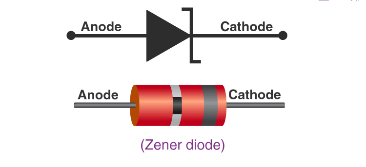 The symbol used to represent a Zener diode in circuit diagrams is similar to that of a regular diode, but with a unique addition. It consists of a triangle or arrowhead pointing towards the cathode side (the side with the band) of the diode. This triangle is accompanied by two perpendicular lines at the cathode end, one extending upwards and the other extending downwards. These lines indicate the specific behaviour of the Zener diode and help distinguish it from other types of diodes in circuit diagrams. The symbol provides a visual representation that allows engineers and technicians to easily identify and understand the presence of a Zener diode in a circuit.